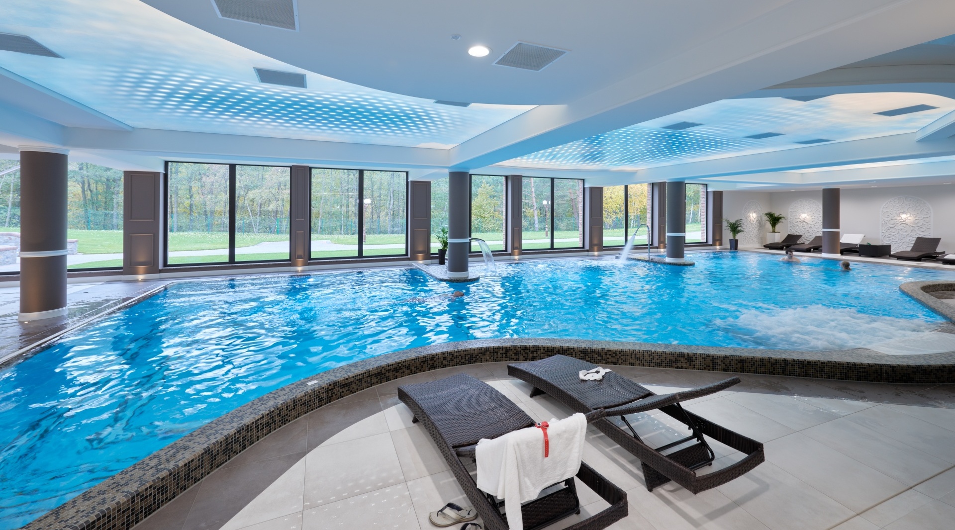 We offer a spacious pool with a soothing view of the forest, two jacuzzis, a paddling pool for the youngest, and an extensive sauna area.